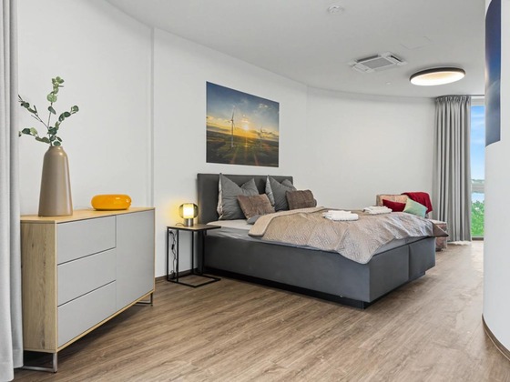 Ein ausrangierter Windkraftturm, eine atemberaubende Aussicht auf die F60 und ein innovatives Wohnkonzept auf rund 70 Quadratmetern Wohnfläche: Am Fuße des Bergheider Sees gibt es eine Ferienwohnung in einem ehemaligen Windkraftturm, die in rund zehn Metern Höhe schwebt und das Thema Strukturwandel wortwörtlich erlebbar macht. Auf rund sieben Metern Höhe befindet sich eine Ferienwohnung, die sich über mehrere Ebenen erstreckt. Ein Balkon mit Seeblick, moderne Innenarchitektur und ein Aufstieg über eine elegante Wendeltreppe verleihen dem Turmprojekt ein einmaliges Erlebnisprofil. Ein besonderer Fokus liegt dabei auf autarker Versorgung und Nachhaltigkeit.