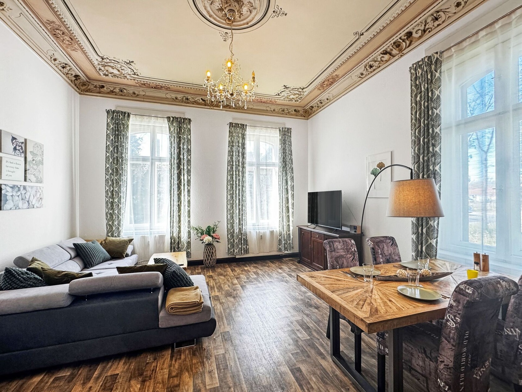 Herzlich willkommen in der "Villa Nieske" in Herzberg (Elster) – dem eleganten und stilvollem Zufluchtsort in einer historischen Jugendstilvilla. Tauche ein in das elegante Ambiente der 102 qm großen Ferienwohnung, die 2023 im Erdgeschoss dieser prächtigen Villa aus dem Jahr 1900 sorgfältig eingerichtet wurde. Ihr stoßt in der Wohnung auf liebevoll erhaltene Fenster und Türen sowie auf Stuckverzierungen, die jedem Raum eine individuelle Note verleihen. Die Schlafzimmer sind mit einfacher, aber eleganter Stuckverzierung versehen, während das Wohnzimmer mit einer detailreichen Stuckdecke beeindruckt – verziert mit Löwenköpfen, kleinen Malereien und Goldverzierungen, ein wahrer Blickfang und Zeugnis der historischen Handwerkskunst. Die "Villa Nieske" bietet zwei behagliche Schlafzimmer, ein prachtvolles Wohnzimmer und eine voll ausgestattete Küche. Im Badezimmer mit Duschwanne könnt ihr entspannende Momente genießen. Die Villa liegt in einer ruhigen Seitenstraße und ist von einem grünen Garten umgeben, der Ruhe und eine natürliche Atmosphäre bietet, fernab von städtischem Trubel. Die verkehrsgünstige Lage ermöglicht es, die Umgebung leicht zu erkunden oder Termine wahrzunehmen.