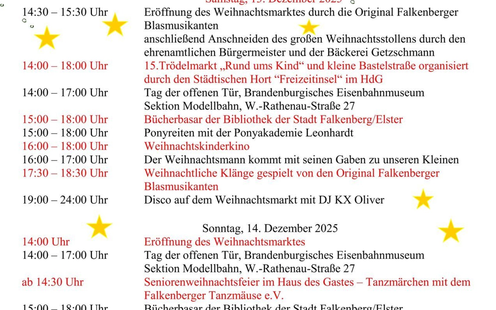 Der Weihnachtsmarkt in Falkenberg/Elster findet dieses Jahr am 13. und 14. Dezember 2025 am Haus des Gastes statt.